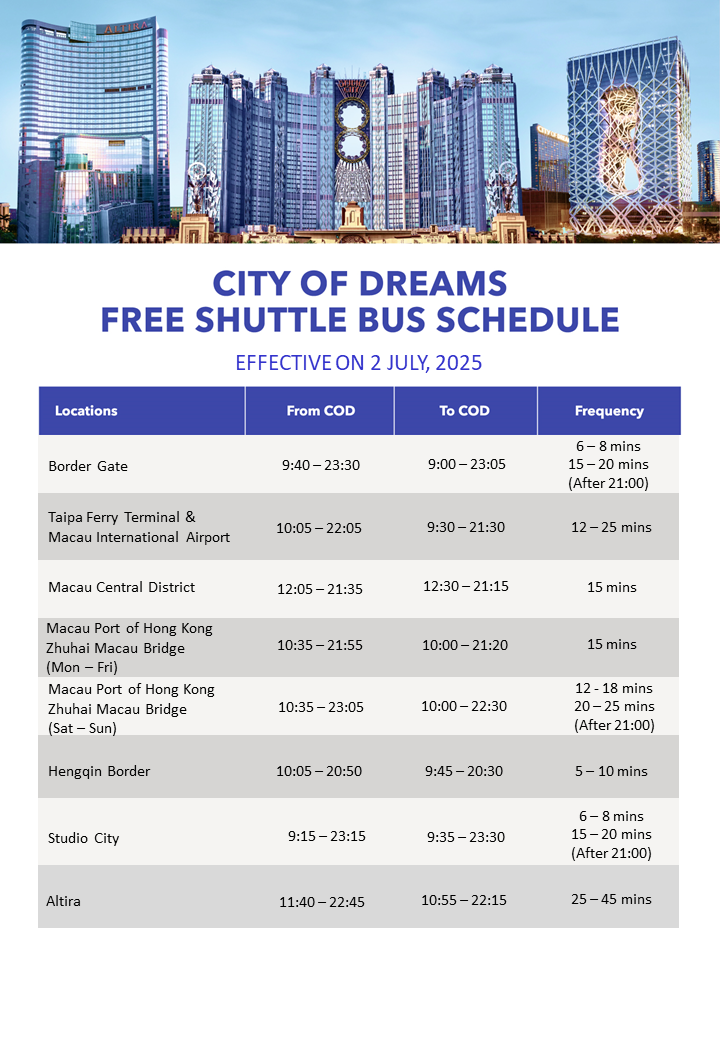 Located just 10 minutes from the Macau Ferry Terminal and Heliport, the Macau Airport, the Macau Lotus Bridge Border and the Taipa Ferry Terminal, and 15 minutes from the Border Gate, Altira Macau is a convenient base from which to explore and enjoy vibrant Macau.