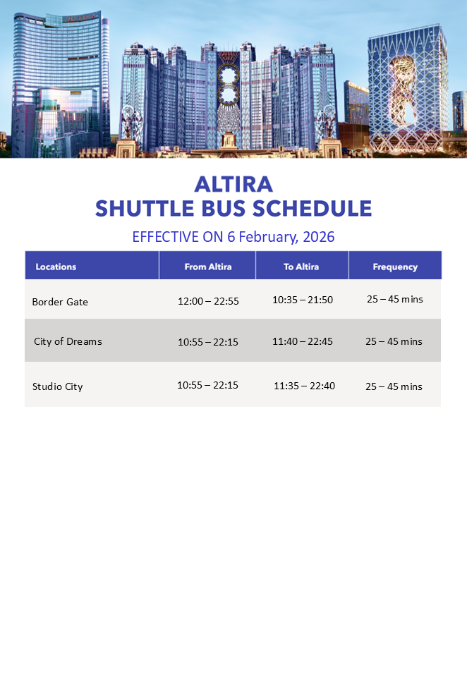 Please contact hotel staff for rates and reservations or call (853) 2886 8888 or email us at enquiries@altiramacau.com
